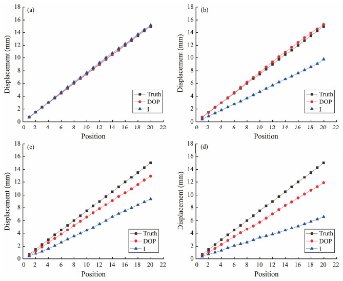 Fig. 4 Accumulated displacement of the metal target under different water turbidity. (a), clear water; (b), 0.5 mL of milk; (c), 1 mL of milk; and (d), 1.5 mL of milk. |