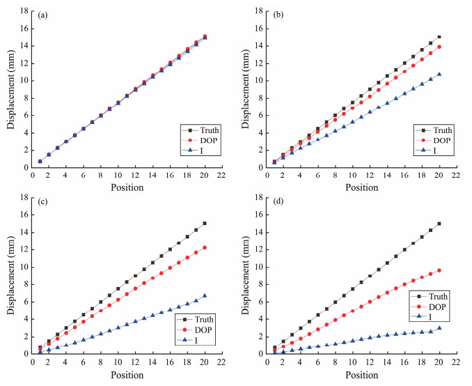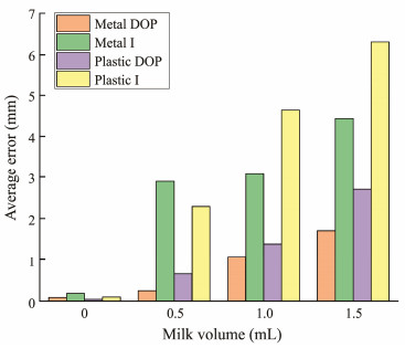 There is a linear relationship between the optical flow values in the image and the actual displacement of the target in motion. To verify the precision of the method, we compared the displacement estimated by the optical flow with the precise displacement recorded by the laser interferometer (Figs.4 and 5). We used an algorithm based on Scale Invariant Feature Transformation (Lowe, 2004) to detect the feature points and averaged their optical flow values. We then utilized the imaging principle to transform the optical flow value into the displacement value. By comparing the estimated displacement value with the truth, we can obtain the displacement precision of the optical flow. In clear water, the methods based on polarization and intensity provide results close to the truth. In turbid water, the deviation between the polarized optical flow and the standard displacement is far less than the normal optical flow. With water turbidity, the tendency becomes evident. We also calculated the average displacement error of the metal and plastic target based on the DOP and intensity images under different water turbidity levels (Fig.6). In water with 1.5 mL of milk, the average displacement errors of metal and plastic targets based on polarized optical flow are reduced by 61.58% and 57.21%, respectively, compared with those in normal optical flow. The polarized optical flow algorithm can obtain accurate displacement information of the target by improving the underwater image contrast between the moving target and background. The displacement error of the metal target based on polarization imaging is always less than that of the plastic target in turbid water due to the optical property of the metal target.