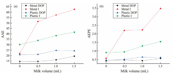 We also calculated the average angular error (AAE) and average endpoint error (AEPE), as shown in Fig.7, to further analyze the precision quantitatively of our method. AAE is the average of the angle between the calculated optical flow vector and the corresponding truth vector, and AEPE is the average of the position deviation of the endpoints of two vectors. In clear water, the AAE and AEPE of the intensity image are close to those of the DOP. With increasing water turbidity, both measures of the intensity image increase remarkably. Meanwhile, the two measures of the DOP image, which are less than those in the intensity image all the time, increase slightly and remain at the same level. In water with 1.5 mL of milk, the AAE of metal and plastic targets based on polarized optical flow is reduced by 68.95% and 41.32%, respectively, compared with those in normal optical flow, and the AEPE is reduced by 83.84% and 59.88%, respectively. The errors for the metal target are less than those for the plastic target in the DOP image because of the characteristics of polarization imaging. The polarized optical flow is more effective and precise compared with the normal method. Polarization imaging can increase estimation robustness and noise immunity, which is significant for overcoming higher underwater image noise from various sources.