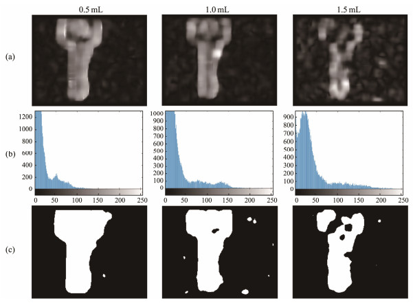 Fig. 8 Moving target segmentation results based on the polarized optical flow field under different water turbidity. (a) Grayscale optical flow image, (b) Grayscale optical flow histogram, and (c) Binarized image segmented using the Otsu method. |