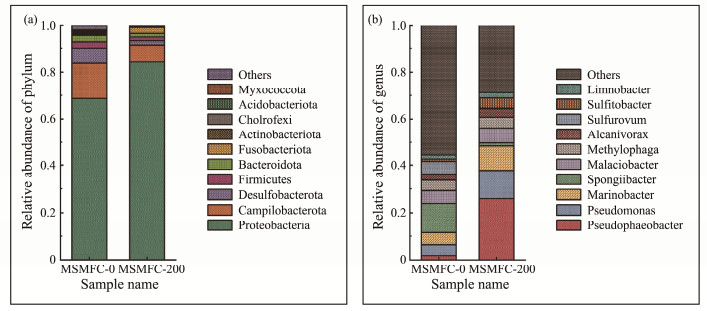 As shown in Fig.3a at the phylum level, the most abundant phylum in MSMFC-200 is Proteobacteria, contributing 84.3% of the total microbial community, followed by the phyla Campilobacterota (6.0%), and Desulfobacterota (2.2%). Some studies have found that Proteobacteria was not only the dominant bacteria for oil degradation, but also able to produce electron transfer mediators for different electron acceptors to promote electricity production (Sette et al., 2007; Krishna and Mohan, 2016). Because the anode surface of MSMFC- 200 was enriched with diversity bacteria, it may produce higher power density and oil degradation rates. Campilobacterota exist in anaerobic environments and are able to participate in the oxidation of sulfides in biological systems (Carrier et al., 2020).