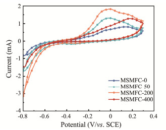3.2 Anode Electrochemical Performance Analysis 3.2.1 Cyclic voltammetry analysisThe cyclic voltammetry curves of anodes were shown in Fig.4, and the specific capacitances were calculated to get the Table 2 according to Eq. (1) (Han et al., 2022)