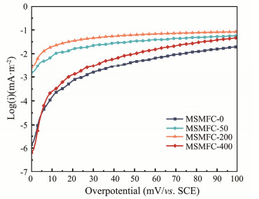 The exchange current density implies the electron transfer kinetic activity and their results were shown in Fig.5 and Table 3 respectively. Among them, the MSMFC-200 has achieved the highest value, which exchange current density is 38.65 times higher than the MSMFC-0 (1.26 × 10−3 mA m−2). This indicates that the addition of rhamnolipids can improve the electron transfer kinetic activity of the anode. The MSMFC-200 has the highest electron transfer kinetic activity, which is consistent with the results of cyclic voltammetry test (Fig.4). The results suggest that rhamnolipids increase the hydrophilicity of the anode surface, making it easier for microorganisms to adhere and degrade oil, while improving the electron transfer kinetics of the anode.