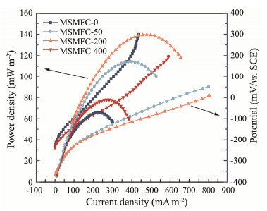 Different anodes in these curves present different capacitance performance. The specific capacitances of MSMFC-0, MSMFC-50, MSMFC-200, and MSMFC-400 by calculation are 127.37, 319.04, 401.45 and 208.80 F m−2, respectively, and the highest oxidation peaks and capacitance value are observed for MSMFC-200 in Fig.4, with the most negative peak potential. The results demonstrate that rhamnolipids can significantly improve anodic capacitive properties and electrochemical activity, which is closely related with its higher percentage of electrogenic bacteria on its surface.