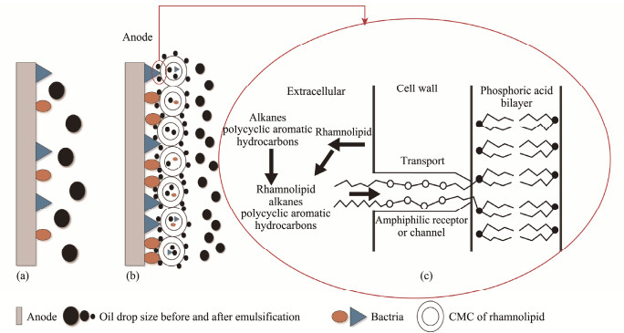 Large droplets of crude petroleum in natural sediment have poor contact with microorganisms on the anode surface, resulting in low bioavailability and degradation rates (Fig.8a). Emulsifying and solubilizing effect of rhamnolipids make the solubility of insoluble crude oil into much finer droplets and disperse them into pore water for full contact with anode, which facilitates its microbial degradation (Fig.8b). In terms of cell structure, the rhamnolipids help anodic bacterial biofilm to contact much more petroleum droplets, thus allowing the finer droplets to enter the cellular 'digestion' channel. As shown in the Fig.8c, phospholipid molecules in the bacterial membrane have a similar structure and polarity as like rhamnolipids, so that stronger affinity and adsorption between oil and membrane caused the solubilization of oil into the bacterial cell. Meanwhile, rhamnolipids would change the cell membrane permeability of petroleum-degrading bacteria and accelerate the trans-membrane transportation of alkanes and polycyclic aromatic hydrocarbons (PAHs) (Mihelcic et al., 1993).