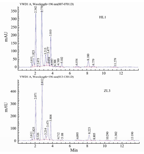 The condition of Chromatographic column is: Agilent Zorbax SB C18 (250 mm × 4.6 mm × 5 μm), Agilent C18, Detection wave te: 196 nm, column temperature: room temperature, mobile phase: mixture of 8 mmol L-1 sodium heptanesulfonate and 0.005%TFA. The pH of mobile phase was adjusted to 5.0 by NaOH.