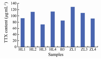 Some representative toxic N. succinctus, N. semoplicatus and N. variciferus samples were selected for TTX content detection. The test indicated that the toxin in Nassarius samples was TTX. The representative chromatomap of HL1 and ZL3 samples are shown in Fig. 3. The toxicity varied in different species or different populations. For example, the TTX content in N. succinctus (HL1) was 87 µg mL-1, the TTX content in N. succinctus (HL2) was 118 µg mL-1, and the TTX content in N. variciferus (ZL3 and ZL4) was 110 µg mL-1 and 90 µg mL-1 respectively (Fig. 4).
