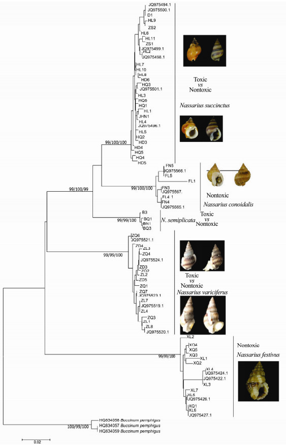 However, so far, the identification of Nassarius species is still confusing, especially for the toxic species. Since the intraspecific shell variation and the various shell forms often lead to the difficulty of Nassarius species discrimination it is arbitrary to identify Nassarius species just based on morphological characters (Haasl, 2000). Thus, it is significant to combine the toxicity detection and the species assignment to determine the toxicity of Nassarius in species and population level, especially based on the molecular tool. Although our previous study revealed some cryptic diversity in Nassarius based on some gene loci the toxicity of the nassariids was not tested. Thus, the species assignment of the various toxic and nontoxic Nassarius is still not clear at the molecular level.