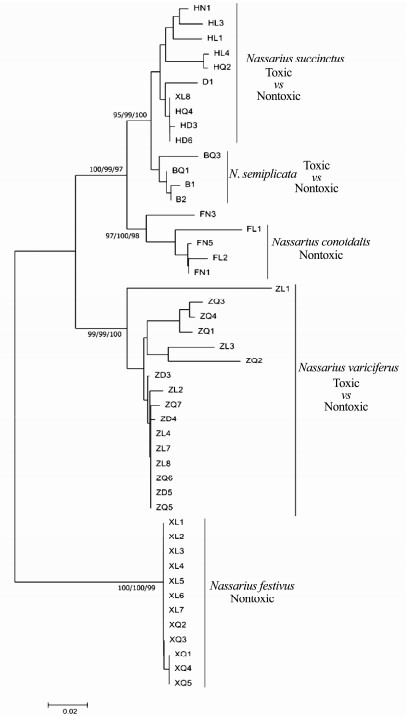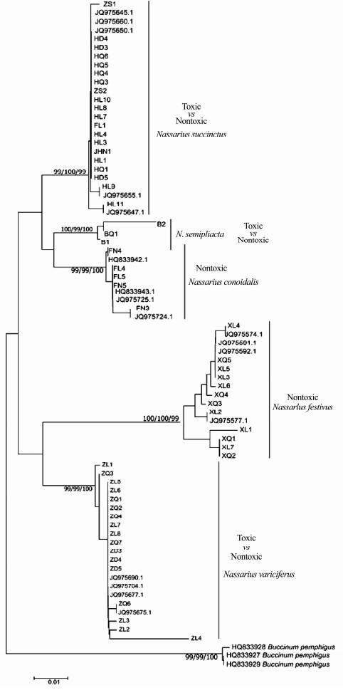 It was indicated that the five Nassarius species, N. variciferus, N. conoidalis, N. semiplicata, N. succinctus and N. festivus, were clearly separated in NJ, ML and Bayesian trees of COI, 16S and ITS genes (Figs. 5, 6 and 7). The published sequence data of each species also clustered together with the sequences got in this study. This indicated that the different toxic species could be distinguished clearly by multiple gene sequences. However, the different toxic populations of N. succinctus and N. variciferus could not be separated from each other, which just clustered together. For example, for both N. succinctus and N. variciferus, the toxic populations from Lianyungang and the nontoxic populations from Dalian and Qingdao were not distinguished. Additionally, the toxic and nontoxic species did not cluster together separately.
