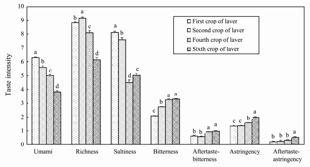 Fig. 1 Taste characteristics of different Porphyra yezoensis crops. The different letters in the same category indicates significant difference (P < 0.05). |