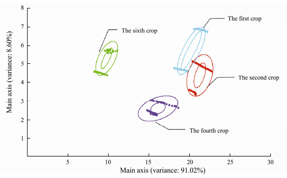 Fig. 2 Results of principal component analysis of different Porphyra yezoensis crops by E-nose. |