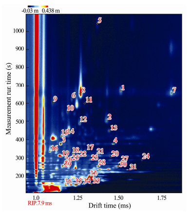 Volatile substances play an important role in the overall flavor of food, and affect consumers acceptance of the products greatly (Werkhoff et al., 1998). Previous studies have confirmed that there is a significant correlation between nori (dried laver) quality and volatile compounds, using a gas chromatography-mass spectrometer (GC-MS) (Miyasaki et al., 2014). GC-MS has been widely used and demonstrated as a powerful analytical method for the determination of volatile compounds in complex samples. However, GC-MS has some disadvantages, such as high requirements for the pretreatment of samples, long detection time, expensive equipment and high maintenance cost. Gas chromatography-ion migration spectrometer (GC-IMS) provides a convenient alternative for the detection of volatile compounds, due to its excellent selectivity and sensitivity, high speed of analysis, small size, and low power consumption as demonstrated by a series of publications (Snyder et al., 1993; Kanu and Hill, 2008; Gerhardt et al., 2018). Furthermore, because IMS separates ions based on mobilities rather than mass, selective detection among compounds of the same mass but different structures are possible (Gerhardt et al., 2018). In this study, GC-IMS was used to analyze the volatile compounds of lavers. GC-IMS separated and identified 36 volatile components (Fig.3.) from laver, mainly including aldehydes, ketones, alcohols, esters, acids and aromatic substances.
