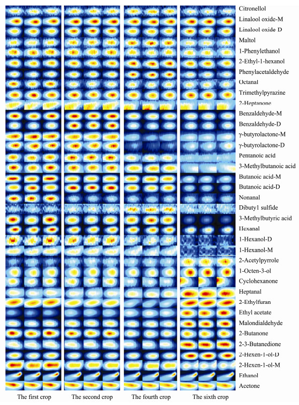 Fig. 4 The major volatile compounds of different P. yezoensis crops. The color depth represents concentration of the volatile compound; M means monomer; D means dimer. |