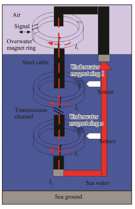 2 Realization of the Seawater Multipath-Channel Hardware Simulator Based on the Induction Coupling Chain Channel 2.1 Transmission Principle of the Ocean Induction Coupling Chain ChannelThe ocean anchor chain transmission channels mainly include transmission and processing equipment, long-distance transmission channels (composed of steel cables and seawater), underwater sensors, and other equipment nodes (Harris and Duennebier, 2002; Kojiya et al., 2005). The transmission principle is based on electromagnetic induction coupling (Zhou et al., 2016). Fig. 1 shows the working principle of the induction coupling seawater transmission channel. The current signal I1 is coupled to the loop composed of seawater and an underwater steel cable through the first-level coupling of an overwater magnet ring to form the current signal I2, whereas, the current signal I3 is formed through the second-level coupling to the underwater magnet ring to complete the signal transmission. In the second transmission loop composed of seawater and a steel cable, the infinite deep-water area serves as the transmission channel, and current signal is disturbed by the multipath effect in the transmission process.