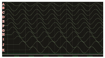 According to the introduction of the multipath-channel hardware simulator and results in Table 1, the 10-channel FPGA hardware simulator is designed. Altera's Cyclone IV E series EP4CE6F18 platform is selected. Each module uses Verilog programming language for the implementation, and ModelSim software is used to analyze the signals with frequencies of 100 kHz, 200 kHz, 500 kHz, 1 MHz, and 24 MHz. The simulation results of each delay waveform with a transmission frequency of 200 kHz are shown in Fig. 3. The FPGA simulation output waveforms denoted by B–K represent the 10 channels of different delays, and A is the output result after stacking. The two key parameters, i.e., amplitude and frequency, of the 10-path superimposed output signals are compared with the results of MATLAB to verify the performance of the multipath simulator. The amplitude and frequency errors of the FPGA hardware simulator's output are controlled within 0.1%, which proves that the multipath FPGA hardware simulator can meet the requirements. As for the output of the hardware simulator, the aliasing signal A is different from the original signal B. If the original signal B is set to 1 V, the mixed signal A is different in various frequencies, and outputs are 0.764, 0.541, 0.096, 0.02, and less than 0.01 V at 100 kHz, 200 kHz, 500 kHz, 1 MHz and 24 MHz, respectively. The results show that the signal-to-noise ratio (SNR) of the transmitted signal will decrease with the increasing transmission frequency because of the multipath time delay, and it will seriously influence the reliability of signal transmission. Therefore, it is essential to realize a communication algorithm that can resist the interference of the multipath channel and improve the transmission characteristics.