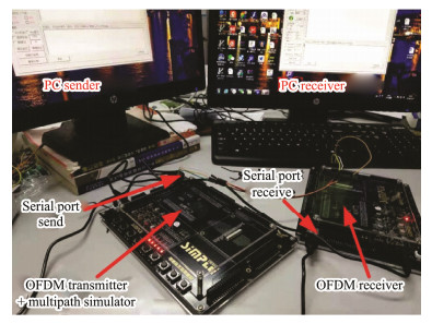 To analyze the signal interference effect of the OFDM technology against the multipath delay, we develop a hardware test platform composed of an OFDM transmission system, a receiving system, and a multipath-channel simulator, among which the OFDM transmission system and multipath-channel simulator are implemented in a FPGA board. The OFDM receiving system is implemented in another FPGA board. The selected board is the Cyclone IV E series EP4CE6F18. The PC is connected to the OFDM transmission and receiving systems through the serial port, and serial port assistant software is used to transmit the data to the OFDM transmission system from the PC. The transmission system performs OFDM modulation on the data, passes the data through the multipath simulator, and then transmits the data to the OFDM receiving system using a short transmission line. The receiving system demodulates the received data to obtain the original data and then transmits the demodulated data to the PC for processing. The hardware platform system is shown in Fig. 6.