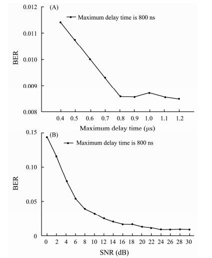 We change the CP length of the OFDM symbol and perform a communication test under the maximum delay of different multipath channels. The error rate of the OFDM symbol under the same maximum delay of different CP lengths is analyzed, and effect of the CP length on the multipath delay is discussed, as shown in Fig. 7. When the CP length of the OFDM symbol is 0, the BER gradually increases with the increase in the maximum delay time, and it quickly appears to be saturated. When the CP length of the OFDM symbol is constant, the BER gradually increases with an increase in the maximum delay time. When the delay time is less than the CP length, the BER tends to be stable. However, when the delay time is greater than the CP length, the BER significantly increases with the increase in the maximum delay time of the channel. For example, when the CP length is 800 ns and channel maximum delay time is less than 800 ns, the BER is stable at approximately 0.0085. However, when the maximum delay time of the channel is greater than 800 ns, the BER gradually increases and becomes 0.0281 when the maximum delay time of the channel reaches 2000 ns. Next, the maximum delay time of the channel is constant, and the length of the CP is changed. Fig. 7 shows that the error rates of different CP lengths are basically the same with and maintained at 0.0080 when the maximum delay time of the channel is less than 600 ns. However, when the maximum delay time exceeds 600 ns, the longer the CP length, the lower the BER.