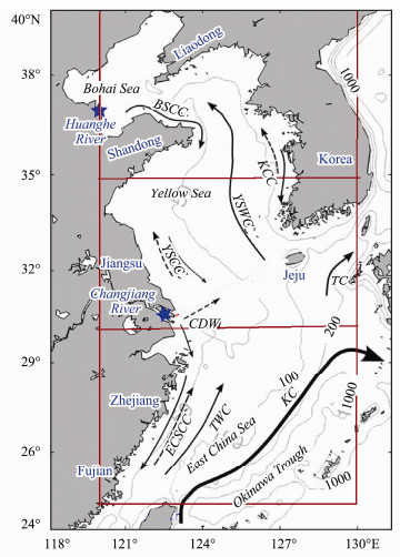 Fig. 1 Surface circulation patterns and bathymetry in the study region of the ECMS (updated based on Zeng et al. (2017)). Study region is the area inside the dark red rectangular frame. Three subregions are divided for Bohai Sea, Yellow Sea and East China Sea. BSCC, Bohai Sea Coastal Current; KCC, Korean Coastal Current; YSWC, Yellow Sea Warm Current; YSCC, Yellow Sea Coastal Current; CDW, Changjiang River Diluted Water; ECSCC, East China Sea Coastal Current; TWC, Taiwan Warm Current; TC, Tsushima Current. Gray contours are 50, 100, and 1000 m isobaths. Blue stars indicate the Changjiang River and Huanghe River Mouths. |