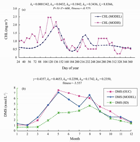 CHL GA calibration had the peak of model simulation matched MODIS satellite data quite well (Fig.10(a)), although there was half month gap between the simulated data and the MODIS data. The first peak was in late March (MODIS data) and middle April (Model data). There was a second peak in early July. DMS had both peaks in May (for model simulation result and OUC field data) (Fig.10(b)). Model simulation shows the second peak in August, which is the peak of calculated DMS using SD method (Fig.10(b)).