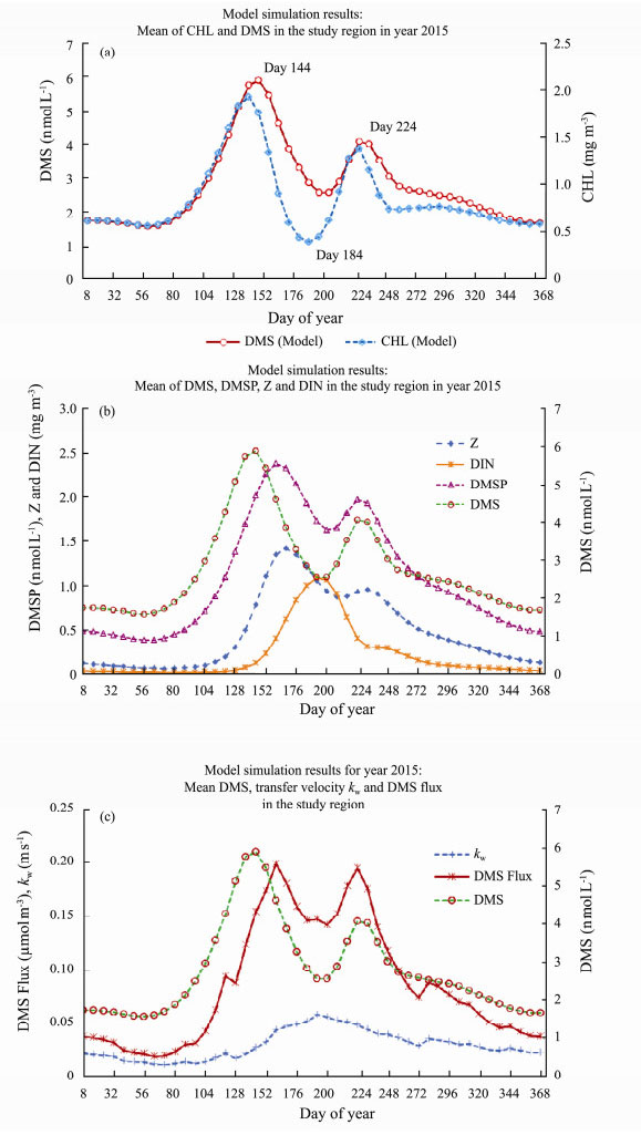 Fig. 11 DMS model simulation results for (a), CHL and DMS time series; (b), DMS, DMSP, zooplankton (Z) and DIN time series; (c), DMS, DMS flux and transfer velocity kw time series. |