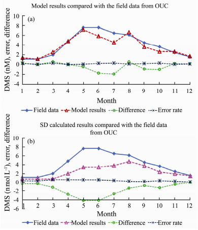 Fig. 12 Monthly mean time series of DMS, and difference and error ratio comparisons (a), for the G93 model simulated DMS results with the field data; (b), for the calculated results using SD method and the field data. |