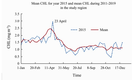 3.1 The CHL and AOD DistributionsFig.2 shows the mean CHL over the period 2011–2019 compared with that in year 2015. Year 2015 had a slightly later peak CHL on 23 April compared to the decadal mean. In general, year 2015 had a similar CHL profile to other years.