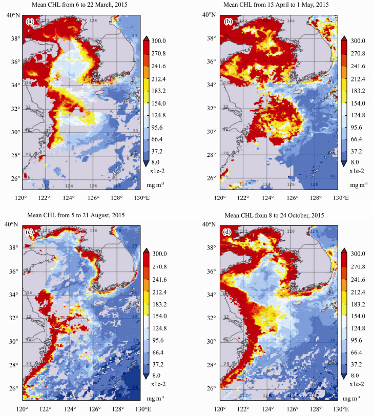 Fig. 3 Time mean images of CHL for the 4 time periods in year 2015. (a), 6 to 22 March; (b), 15 April to 1 May; (c), 5 to 21 August; (d), 8 to 24 October, in the study region. |