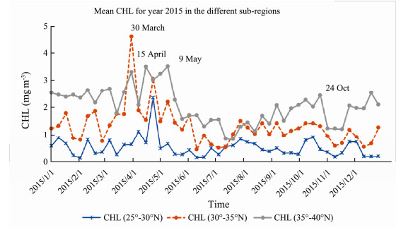 Mean CHL time series in year 2015 for the different sub-regions is shown in Fig.4. The northern region had higher profile than other two subregions. However, middle region had highest CHL peak in the 30 March. Northern region reached to CHL peaks in the 15 April and the 9 May. Southern region had lowest CHL in general, with peak arrived in the 1st May. Northern region had higher winter CHL profiles apart from the end of March..
