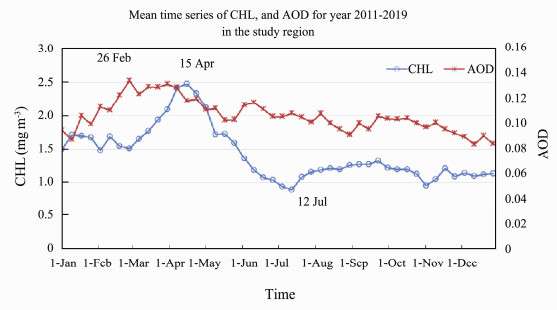 Fig. 5 Mean time series of CHL and AOD for year 2011–2019 in the study region. |