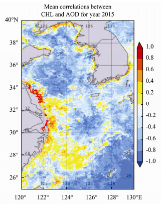 The decadal mean time series of CHL for the period 2011–2019 is plotted together with the mean of AOD for the same time period (Fig.5). CHL peaked on 15 April and reached a minimum around 12 July. The AOD peak was around 26 February, stayed high during March, and started to decrease after April. The correlation of CHL and AOD is around 0.5 for the 9-year time period. The mean correlations between CHL and AOD in year 2015 are shown in Fig.6. High correlations are evident along the west coast of the Yellow Sea and in Jiangsu and Zhejiang Provinces coastal waters. The positive correlation region is stronger in the southern region, with negative correlations in the northern region and positive along the western coast of the southern region.