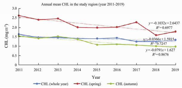 The trend in annual mean CHL for the study period is shown in Fig.7. CHL decreased 3.66% for the whole time period, decreased more than 10% during spring time (March–May) and decreased 7.91% during autumn time (August and October). Annual mean AOD decreased insignificantly (only 0.07%) for the whole time period, decreased 0.11% and 0.06% during spring time and autumn time respectively (not shown in the figure).