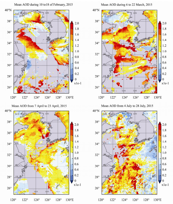 Fig. 8 Time mean images of AOD for the 4 time periods in year 2015: (a), 10 to 18 February; (b), 6 to 22 March; (c), 7 to 23 April; (d), 4 to 28 July. |
