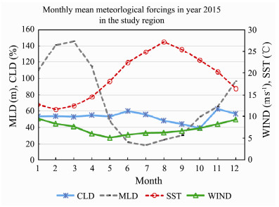 The monthly mean meteorological forcings in year 2015 are calculated according to the satellite derived data (Fig.9). CLD is mainly within 50%–60% in the study region. October had less cloud (around 40%) than other months. SST had its peak in August and reached to more than 27℃. MLD had its peak in March and reached as deep as 145 m. The summer MLD had its valley in July and only reached to the depth of 20 m. WIND was winter high and summer low. Average WIND range is within 5–10 m s−1.