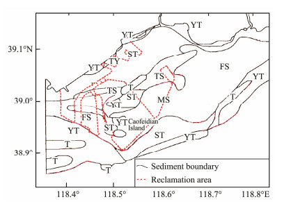 Fig. 9 The sediment types in the Caofeidian sea area before reclamation (revised from Jia et al., 1999). The red dotted line enclosed the later reclamation area. MS, medium sand; FS, fine sand; TS, silty sand; ST, sandy silt; T, silt; YT, clay silts; TY, silty clay. |