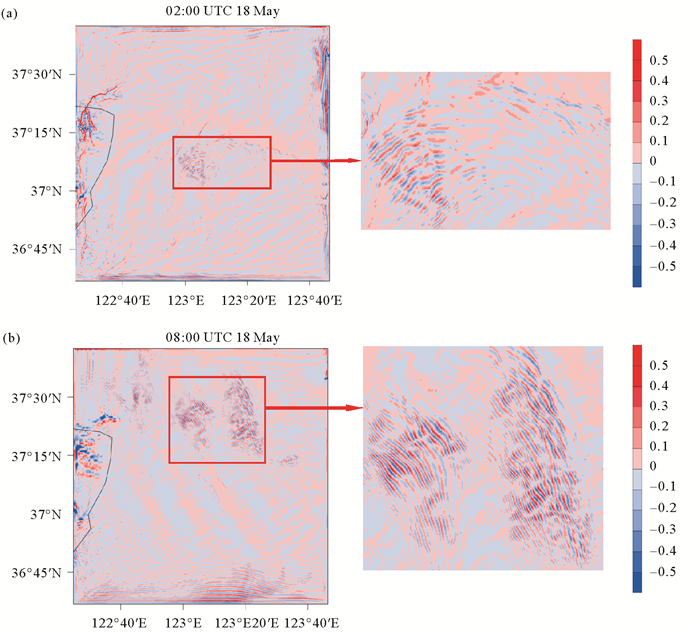 4 模式结果分析为了验证猜想,进一步探究海雾发展过程与重力波之间的关系,利用WRF模式嵌套LES模式模拟了此次海雾过程。图 10~11的区域对应图 1的D04区域。模式底层的水平云水混合比在18日00:00—04:00 UTC(见图 10 (a)~(c))显示的雾区与上述的大片海雾北侧延伸出的小团海雾的观测事实基本一致,图 10(b)雾区的形态与MODIS云图显示的雾区形态高度吻合,图 11(a)是该时刻的垂直速度w,对应在这片海雾的北侧边缘存在明显的重力波,后续向北移动发展,雾区面积增大(见图 10(c))。LES还模拟出了船测海雾时段后大片海雾整体向东北发展的过程(见图 10(d)~(f))。06:00—10:00 UTC有大面积的海雾向东北方向扩散,海雾的边缘移动的速度约8 m/s,此时是5 m/s的南风。结合08:00 UTC垂直速度分布图(见图 11(b))观察到在大片海雾移动方向的下游有明显的波长为1.2~2.0 km重力波,波动特征与激光雷达测风数据(见图 6(b))反映的重力波的波长、周期、速度等特征均吻合。由此可知,不论是山东半岛东部的小范围海雾,还是后期发展较迅速的大范围海雾,其发展方向的前缘均有明显的重力波存在,海雾边缘的形态与重力波相位传播形态类似,并且与重力波相位移动的方向一致。可见重力波参与海雾生成和发展的过程,并起到重要的作用。