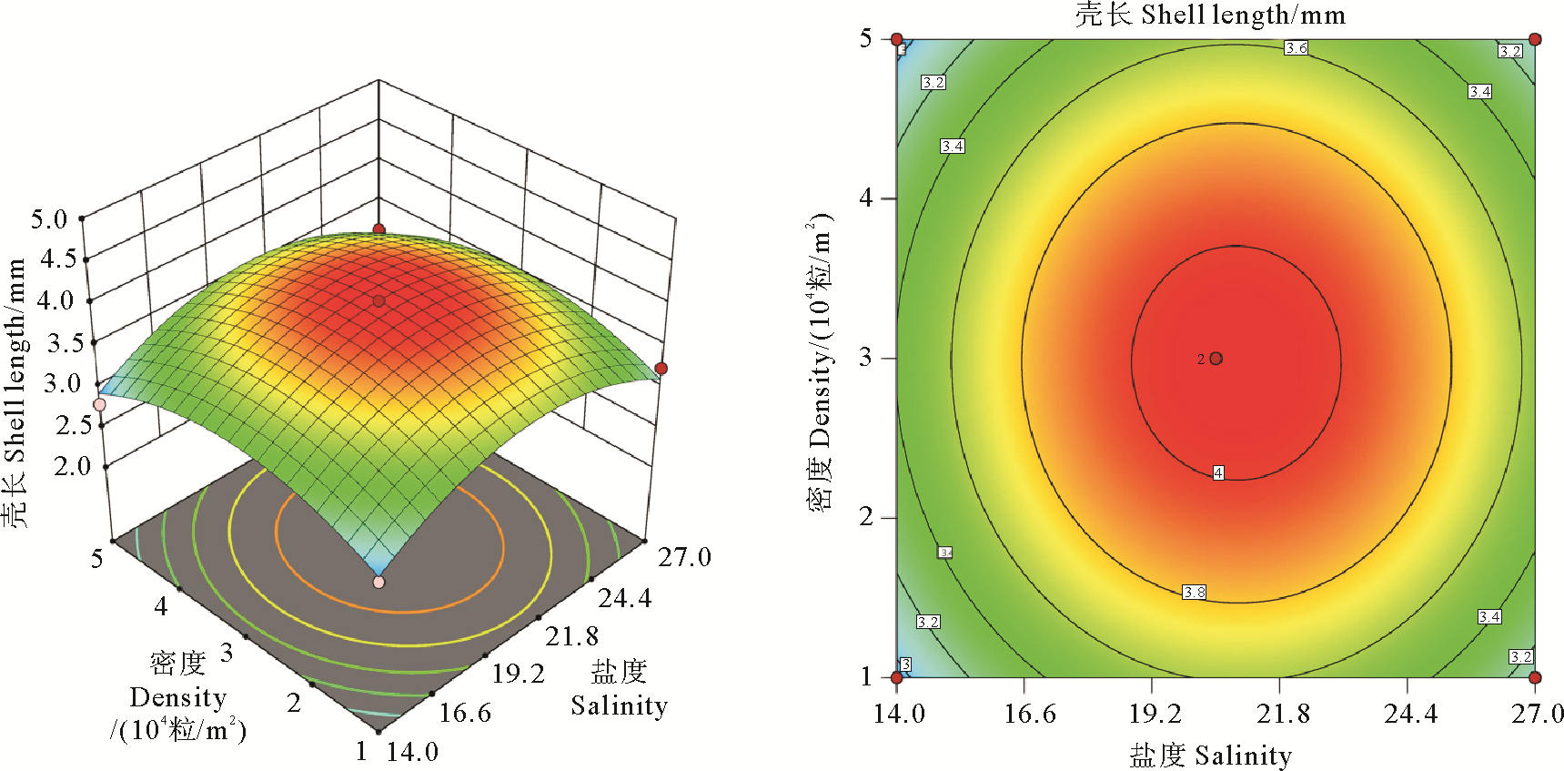 通过Design-Expert 12软件对壳长数据进行分析,建立二次响应面回归模型,分析结果见表 3。获得壳长预测值Y对编码自变量温度(T)、盐度(S)和密度(D)的二次多项回归方程:Y=-6.366+0.276T+0.584S+0.636D-0.0004 TS+0.002 8TD-0.000 6SD-0.005 66T2-0.013 7S2-0.115 9D2。式中:TS为温度与盐度的互作效应;TD为温度与密度的互作效应;SD为盐度与密度的互作效应;T2为温度的二次效应;S2为盐度的二次效应;D2为密度的二次效应;R2为模型的决定系数;Adjusted R2为模型的校正决定系数;Predicted R2为模型的预测决定系数。R2=0.787,Adjusted R2=0.306,Predicted R2=-2.415;模型的决定系数R2为0.787,说明总变异的22%不能用此模型解释。该模型不显著,所以需要进一步优化,优化后的结果见表 4。重新回归后的方程:Y=-6.331 05+0.276 5T+0.573S+0.689D-0.005 66T2-0.013 7S2-0.115 9D2, 式中:R2=0.781 6,Adjusted R2=0.594 4,Predicted R2=0.126 5;模型的决定系数R2为0.781 6,说明该模型能解释78.16%的变化,该模型达到显著性水平(P < 0.05,见表 4)。由方差分析可知,温度、盐度、密度对模型影响不显著(P>0.05),但是温度、盐度、密度的二次项对模型的影响显著(P < 0.05),其中盐度的二次项对模型产生的影响极显著(P < 0.01);利用此模型在多因素条件下进行分析和预测,可计算出三因素下的最优条件: 温度为24.32 ℃,盐度为21.13,密度为2.88×104粒/m2,此时壳长可达最大值4.07 mm。