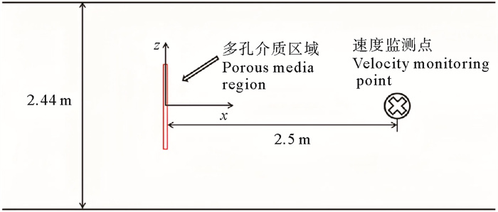 本研究所建立的数值模型如图 1所示,数值水池的长为5.0 m、宽3.66 m、高2.44 m,多孔介质模型的厚度设置为0.05 m,距离速度入口1.5 m。网衣密实度可由Kristiansen[27]提出的计算公式获得: