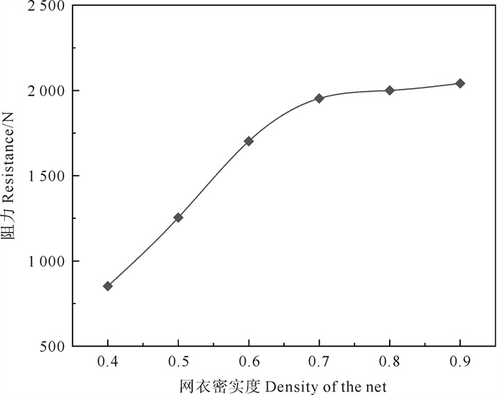 针对密实度分别为0.4、0.5、0.6、0.7、0.8和0.9的网衣多孔介质模型,计算并设置了其黏性阻力系数和惯性阻力系数,截取XZ平面水池中心得到的流场情况如图 9所示。可见,密实度越大,流速衰减的宽度范围越大,且密实度超过0.8时,由于绕流现象的影响出现较低流速区域包围较高流速区域情况。网衣阻力随密实度增加呈先快速增加后缓慢增加(见图 10)。流场和网衣阻力变化与整体网箱网衣流场和网衣阻力变化情况相符。