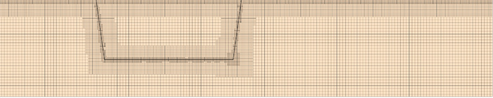 本研究根据烟台经海系列养殖网箱,建立了网纲模型和多孔介质模型,示意网衣覆盖区域,上端长边45 m,短边4.2 m,下端边长42.75 m,高度为30 m,养殖网箱20 m位于水下,如图 11和12所示,多孔介质模型厚度为0.06 m。数值水池X方向长164 m、Y方向宽102 m、Z方向水深32.5 m。网衣位于水池中央,距离速度入口56.5 m,网格采用切割体单元,将目脚长度30 mm且密实度0.178的网衣多孔介质模型进行网格收敛性分析(见表 4),为节约计算资源同时保证结果的准确性,最终选择网格尺寸为0.48 m,对网衣周围和自由液面进行局部加密,加密后的网格尺寸为0.24 m,网格划分情况如图 13所示。考虑网衣距离海底较近,将水池底面设置为壁面,除压力出口外,其他均设置为速度入口,入口来流速度设置为v=1.5 m/s。