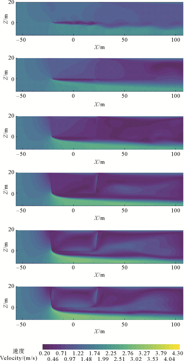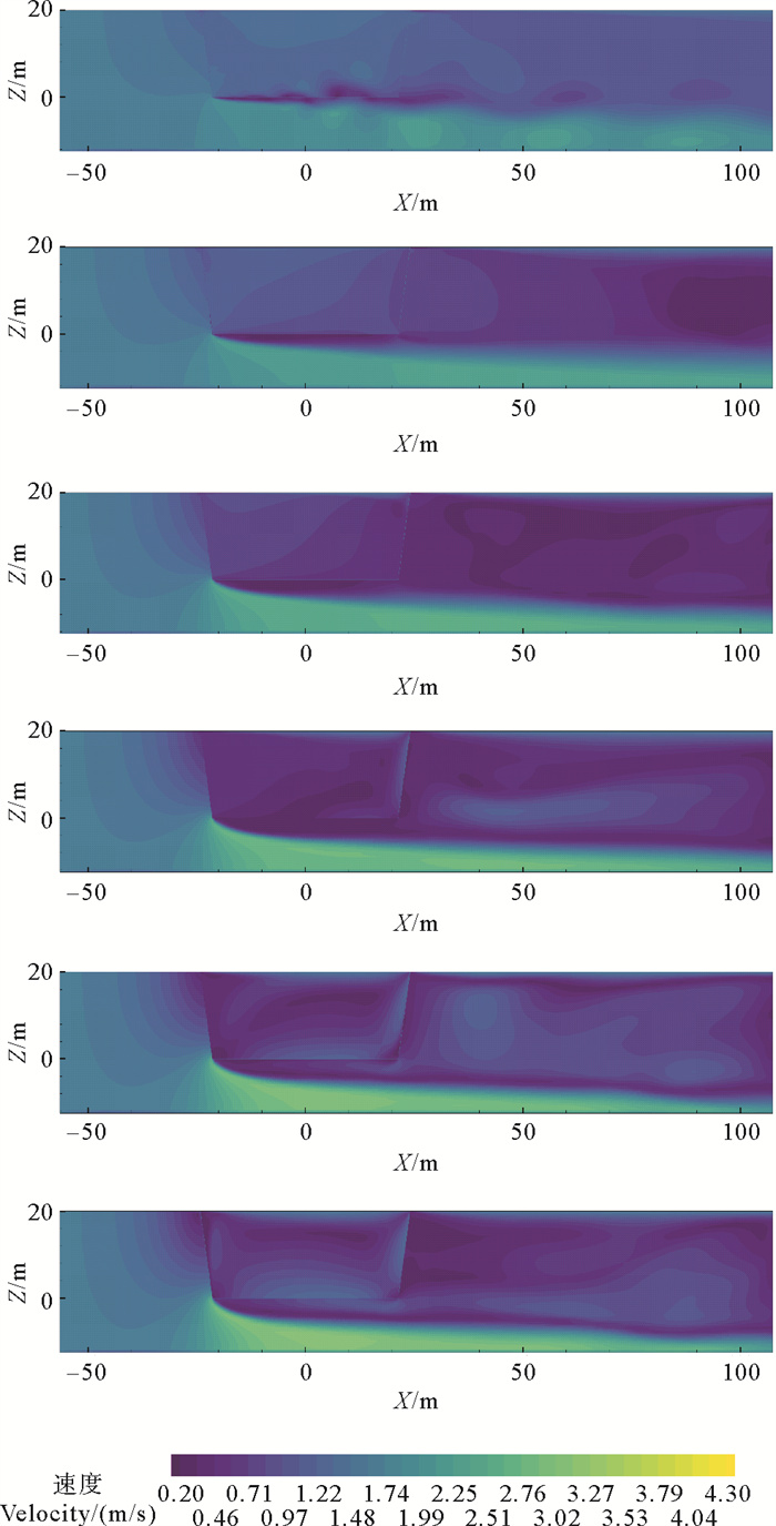 截取XZ平面水池中心处,可获得两种网目下不同生物附着程度网衣流场分布如图 12、13所示,从上到下由生物附着程度影响的网衣密实度分别是0.4、0.5、0.6、0.7、0.8和0.9,可以看出,来流在经过网衣前就开始发生衰减,衰减区域呈扇形分布;流经网衣后,由于网衣的阻碍作用,来流发生明显的衰减,衰减区域与网箱高度范围大致相等;由于底网与来流方向平行,密实度为0.4时,网箱底网位置绕流现象较为明显,底网后方尾流流速更低,底网下方流速增加;随密实度增加,网箱后方流速衰减得越发明显,不利于区域水体交换,同时网箱底部流速增加越大,对网衣后方底部冲刷逐渐增强,不利于网箱的稳定;图 14和15对比可以发现,密实度相同时,目脚长度30和60 mm的网箱区域流场分布情况比较接近,可见,网箱区域的流场变化主要受密实度影响,目脚长度对其影响较小。