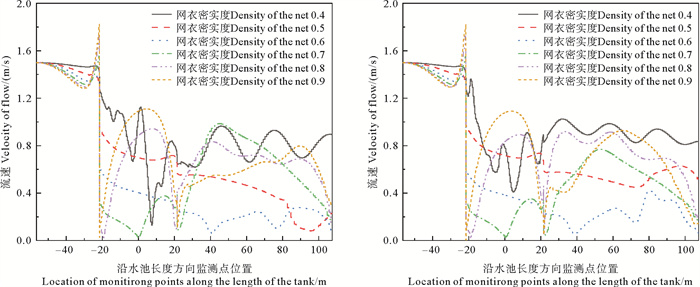 图 16、17和18分别为30 mm目脚长度和60 mm目脚长度下的网衣底面中心上方1、5和10 m处沿着水池长度方向变化发生的流速变化对比图,可以看出生物附着程度相同时,不同网目网衣周围相同位置的流速变化基本一致,在网衣底面中心上方,随高度变化,流场受网箱底部网片和绕流现象的影响逐渐减小,因此,当密实度较小时,越靠近网底,流场波动越剧烈;在网衣底面中心上方10 m处,密实度低于0.4,流速先衰减后趋于稳定,密实度高于0.4,流速先衰减后有回升,这是因为随密实度增加,网衣结构逐渐趋于封闭的实体,流速衰减程度越大,衰减范围越小,随流速波动越快开始回升,密实度低于0.4的网衣结构中心流速趋于稳定,相对于未附着生物时的流速,平均幅值分别下降了10.851%、12.314%、31.433%和46.537%。