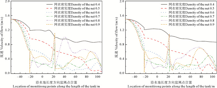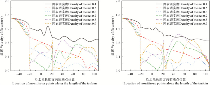 (1) 随密实度增加,网箱后方流速衰减得越发明显,越不利于区域水体交换,同时网箱底部流速增加越大,对网衣后方底部冲刷逐渐增强,不利于网箱的稳定。