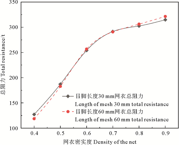 网衣总阻力随生物附着程度变化如图 19所示,可以得到目脚长度30 mm与目脚长度60 mm生物附着程度不同时受到的总阻力大小,可见生物附着程度相同时,网衣受到的总阻力近似相等,且网衣总阻力随密实度变化趋势均呈先快速增加后缓慢增加。因此,要尽量控制网衣的生物附着程度,否则网衣受到的总阻力会急剧增加,极大破坏了网衣的安全性,加剧了网衣破损的风险。同时相同规格尺寸的网衣,网目长度越大,生物附着程度越小,网衣所受阻力越小,实际工程中,在满足所有要求的同时,应尽可能选择较大的网目长度,有利于保障网衣的安全性。
