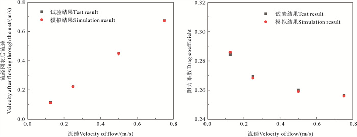 提取速度监测点的流速和网衣阻力系数与试验结果对比,结果如图 2所示。可知数值模拟结果与试验结果误差不超过5%,可认为多孔介质模型能够较好地模拟网衣周围的流场特征。