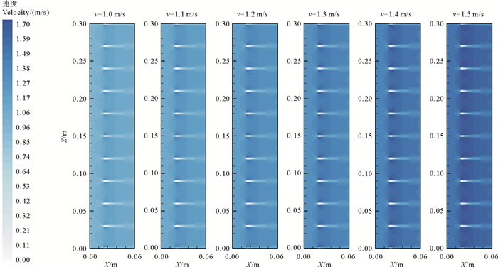 图 5 不同流速下网衣周围的流速分布 Fig. 5 Velocity distribution around the net at different velocities |