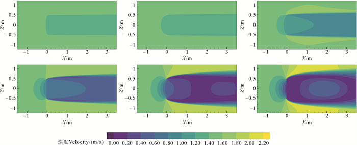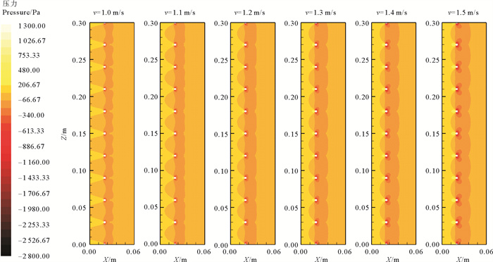 设置来流速度分别为1.0、1.1、1.2、1.3、1.4和1.5 m/s来对网衣周围流场进行数值模拟,进而求解多孔介质模型的黏性阻力系数和惯性阻力系数,通过截取XZ平面,展示了不同流速下网衣周围沿水池长度方向的速度和压力分布,结果如图 5和6所示。