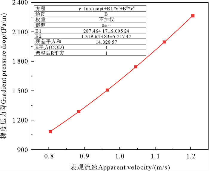 然后监测水池速度入口和压力出口处的压力值大小可获得网衣前后的压力降,将压力降的数值大小除以水池长度可获得梯度压力降,将不同来流速度下的网衣梯度压力降进行拟合[28],得到的拟合曲线如图 7所示。
