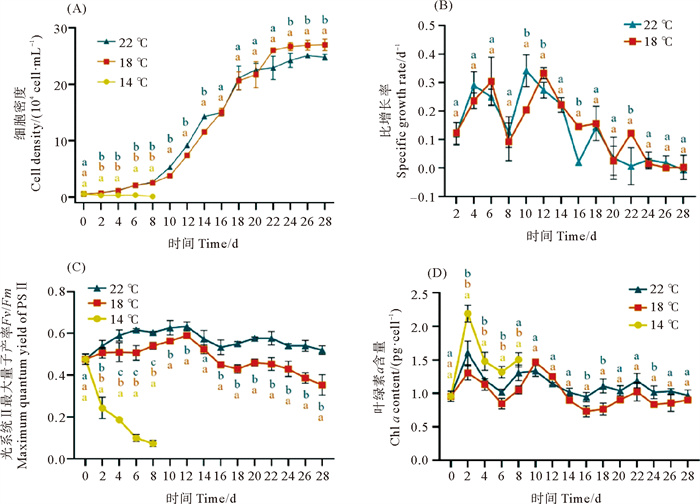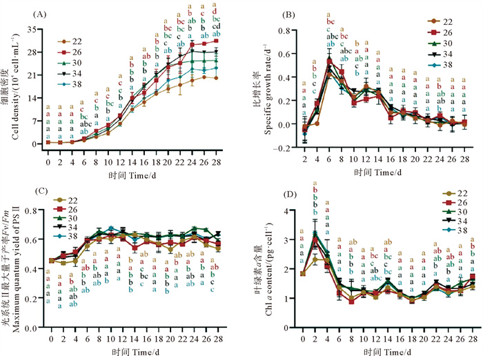 ( 不同字母代表存在显著差异p < 0.05。Different letters indicate that the difference is significant at 0.05 level. ) 图 2 不同温度条件下腹孔环胺藻AZDY06的生长曲线(A)、比增长率(B)、光系统Ⅱ最大量子产率(Fv/Fm)(C)和叶绿素a含量(Chl a)(D) Fig. 2 Growth curves (A), specific growth rate (B), maximum quantum yield of PSII (Fv/Fm) (C), and chlorophyll a content (D) of A. poporum AZDY06 at different temperatures |