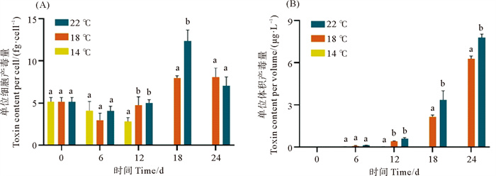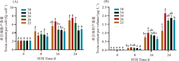 ( 不同字母代表存在显著差异p < 0.05。Different letters indicate that the difference is significant at 0.05 level. ) 图 3 不同温度条件下腹孔环胺藻AZDY06的单位细胞产毒量(A)和单位体积产毒量(B) Fig. 3 Toxin production per cell (A) and per unit volume (B) of A. poporum AZDY06 at different temperature |