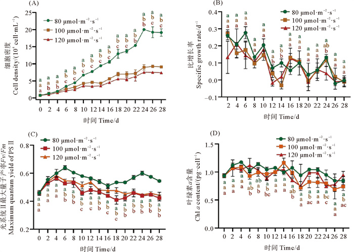 随着光照强度的增加,藻细胞生长逐渐受到抑制(见图 6(A)),光照强度为80 μmol·m-2·s-1时藻细胞生长最好,最大藻密度达到2×105 cells·mL-1,而光照强度为120 μmol·m-2·s-1时藻细胞生长情况最差,仅为1×105 cells·mL-1,且100和120 μmol·m-2·s-1光照强度条件下藻细胞分裂缓慢,生长趋势平缓。从第6天开始,除第18、22和24天外,其余测定天数不同光照强度处理组藻密度均差异显著(p < 0.05)。不同光照强度处理组比增长速率总体呈现下降的趋势,第6天80 μmol·m-2·s-1处理组比增长速率最大(0.28 d-1),到第26天比增长速率接近0,比增长速率在第12、14、24天有显著性差异(p < 0.05),其中第12天120 μmol·m-2·s-1处理组比增长速率显著低于其余两组,第14天80 μmol·m-2·s-1处理组比增长速率显著高于其余两组,第24天80 μmol·m-2·s-1处理组比增长速率显著高于120 μmol·m-2·s-1处理组(p < 0.05)(见图 6(B))。